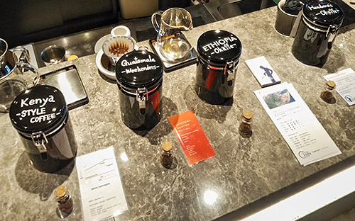コーヒー豆が入った容器には、豆の種類に併記された見慣れた店名が。この辺りでは知られた焙煎所からコーヒー豆を仕入れています。