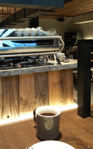 打ちっぱなしのコンクリートに黒く塗られたスチールは極めて無機質ですが、そこにダークウッドが加わって粋な空間を作り上げています。
